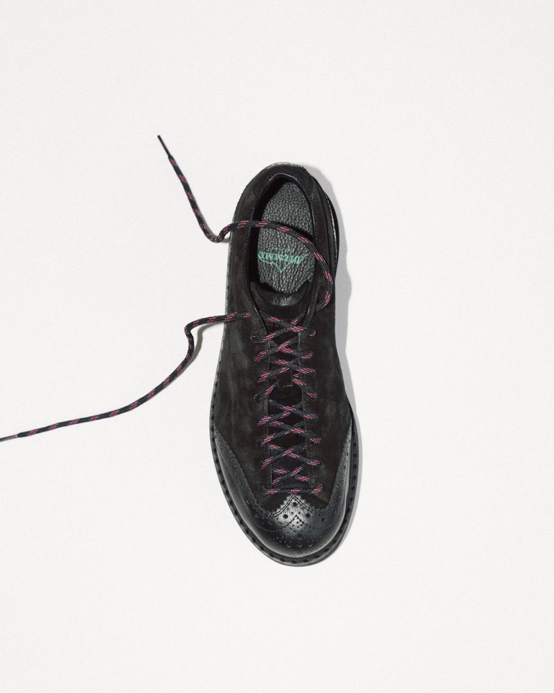• Ampezzo with a twist. This version features a wingtip toe cap and full brogue detailing inspired by fine Italian dress shoes. Zigzag edges, tonal stitching, and decorative perforations bring a sophisticated layer to this rugged silhouette. Built for the city with alpine roots.