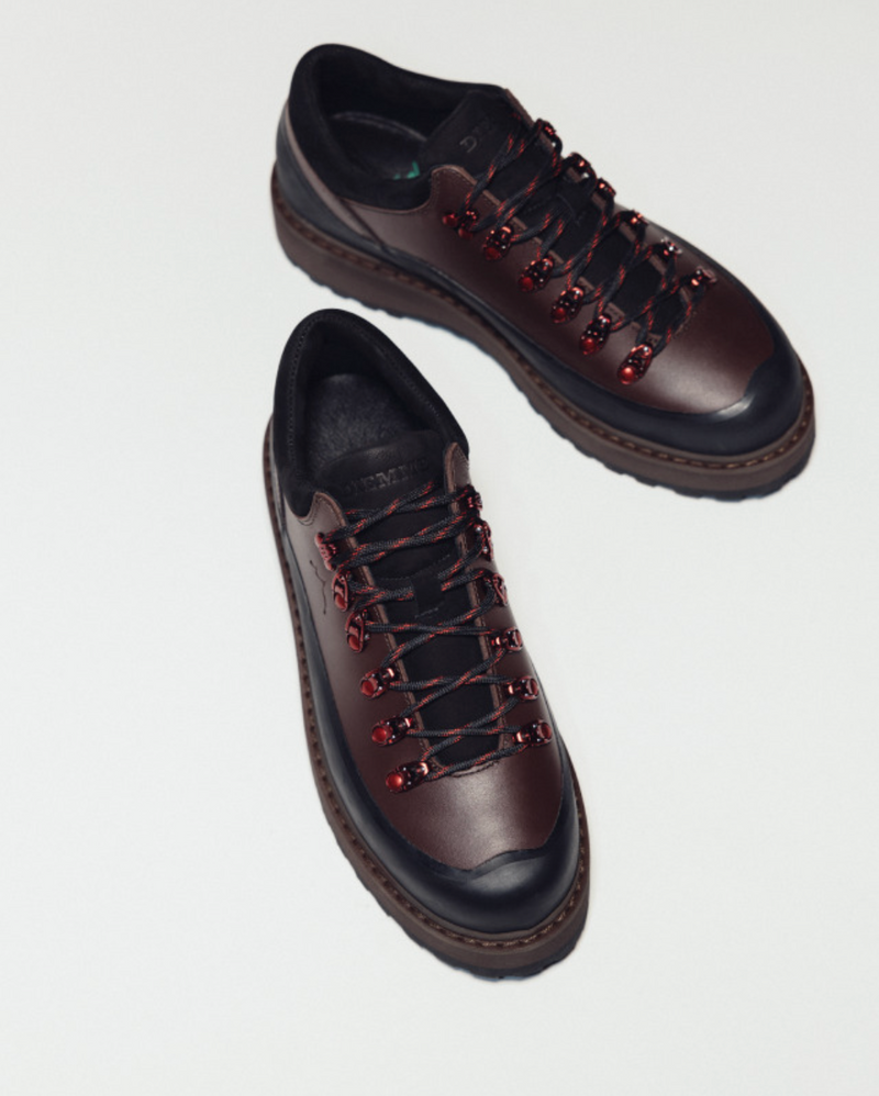 Cornaro Gomma gives the original Cornaro a contemporary twist. It features a wide tonal rubber rand and tonal hardware with matching hiking laces. Crafted from sturdy wax-treated suede for water resistance, this lightweight low-top is a practical and comfortable option for everyday wear. Designed for shifting weather and inspired by alpine classics.
