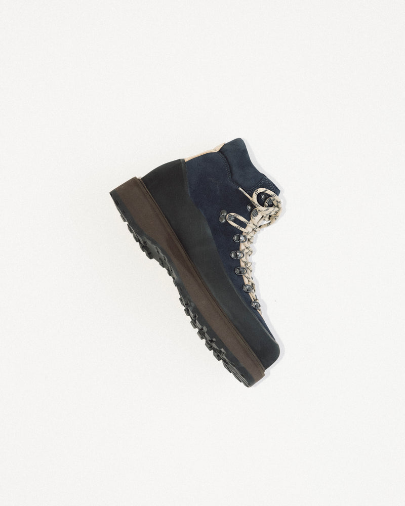 • Roccia Vet Gomma builds on the original with added protection. A tonal rubber rand and rubber mudguard shield the upper from moisture and wear, while the classic D-ring lacing system stays true to its hiking roots. Set on a lightweight platform sole and designed for everyday movement in the city.